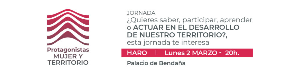 El próximo lunes 2 de marzo a las 20:00 horas, el Palacio de Bendaña de Haro será el escenario de una nueva jornada del proyecto Protagonistas: Mujer y Territorio, una iniciativa que invita a reflexionar sobre el papel activo de la ciudadanía en el desarrollo territorial.