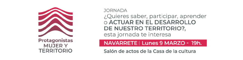 El próximo lunes 9 de marzo a las 20:00 horas, el Salón de Actos de la Casa de Cultura de Navarrete (entrada por calle Mayor Alta, 1) acogerá una nueva jornada del proyecto Protagonistas: Mujer y Territorio, una iniciativa que invita a reflexionar sobre el papel activo de la mujer en la dinamización social y económica de nuestros municipios.